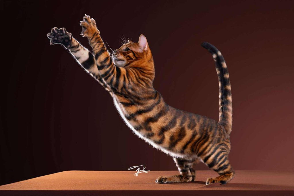 身體:身體條紋通常應垂直排列,頸部、腿部和尾部的斑紋呈環狀。粗獷、交織、不規則的條紋,包括伸展的玫瑰花紋,是更佳的選擇。允許有一些拉伸的斑點。腹部和腿內側必須有標記。白色底色應包括腹部腹側、尾巴根部下方、腿內側和胸 部。為了增加辨識度,白色底色可以延伸或覆蓋到身體兩側下 方、腿後側和胸側。爪墊和尾尖必須為黑色。